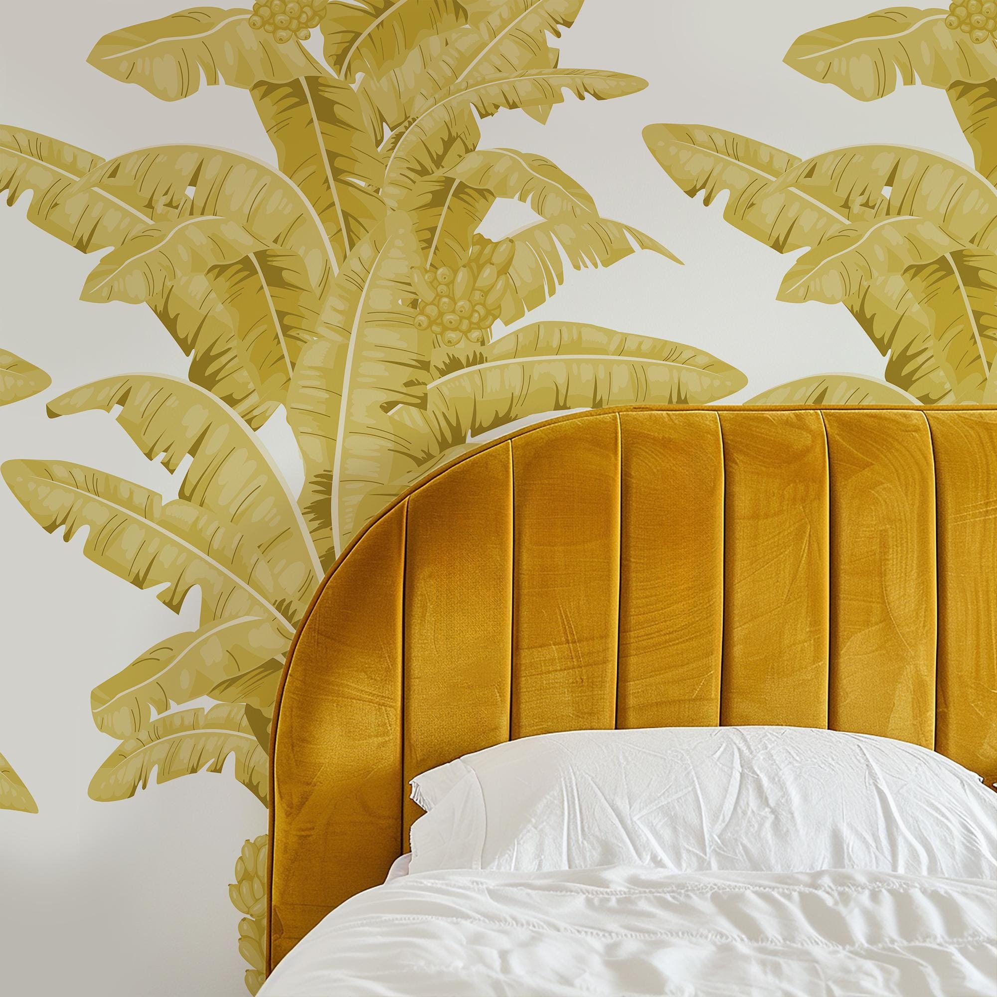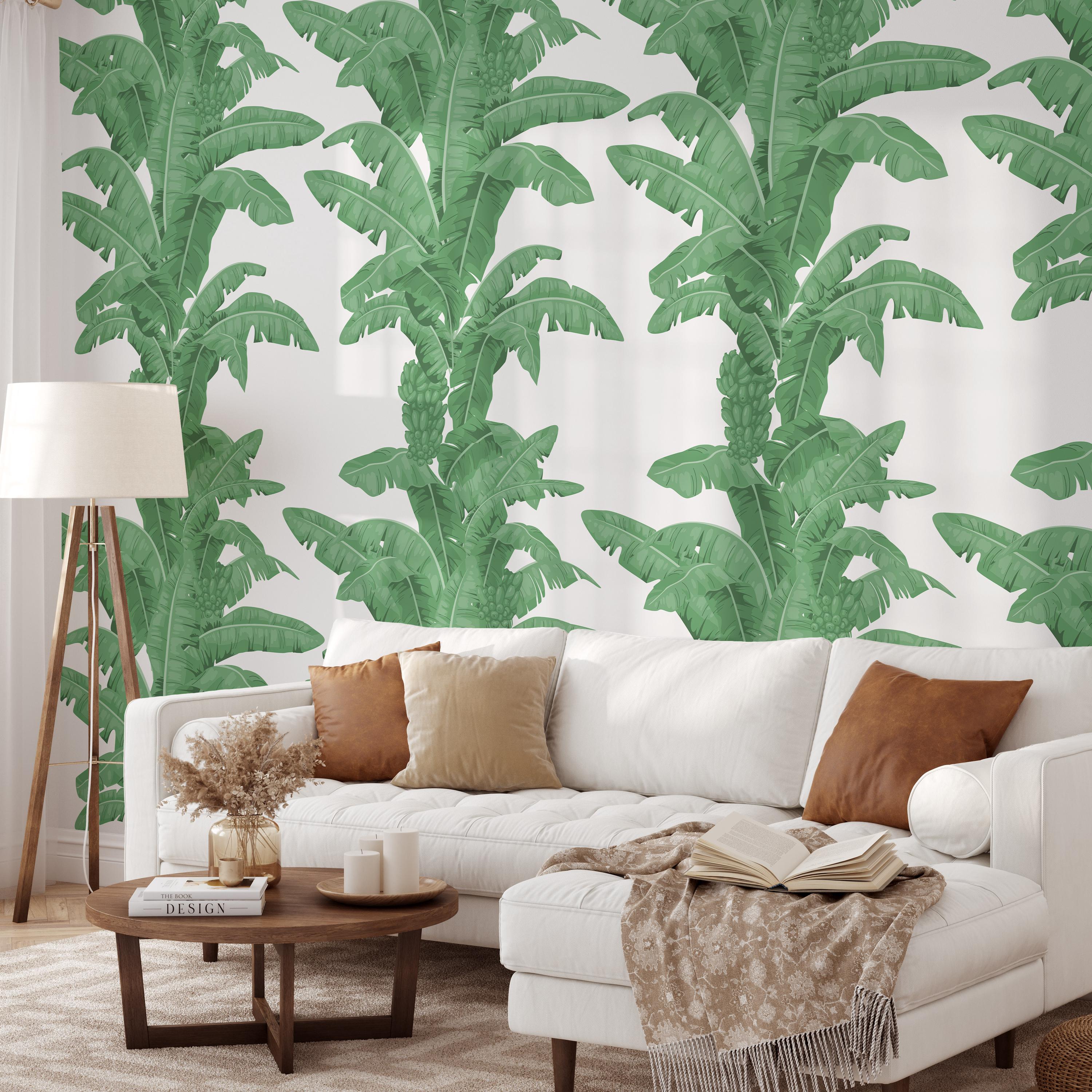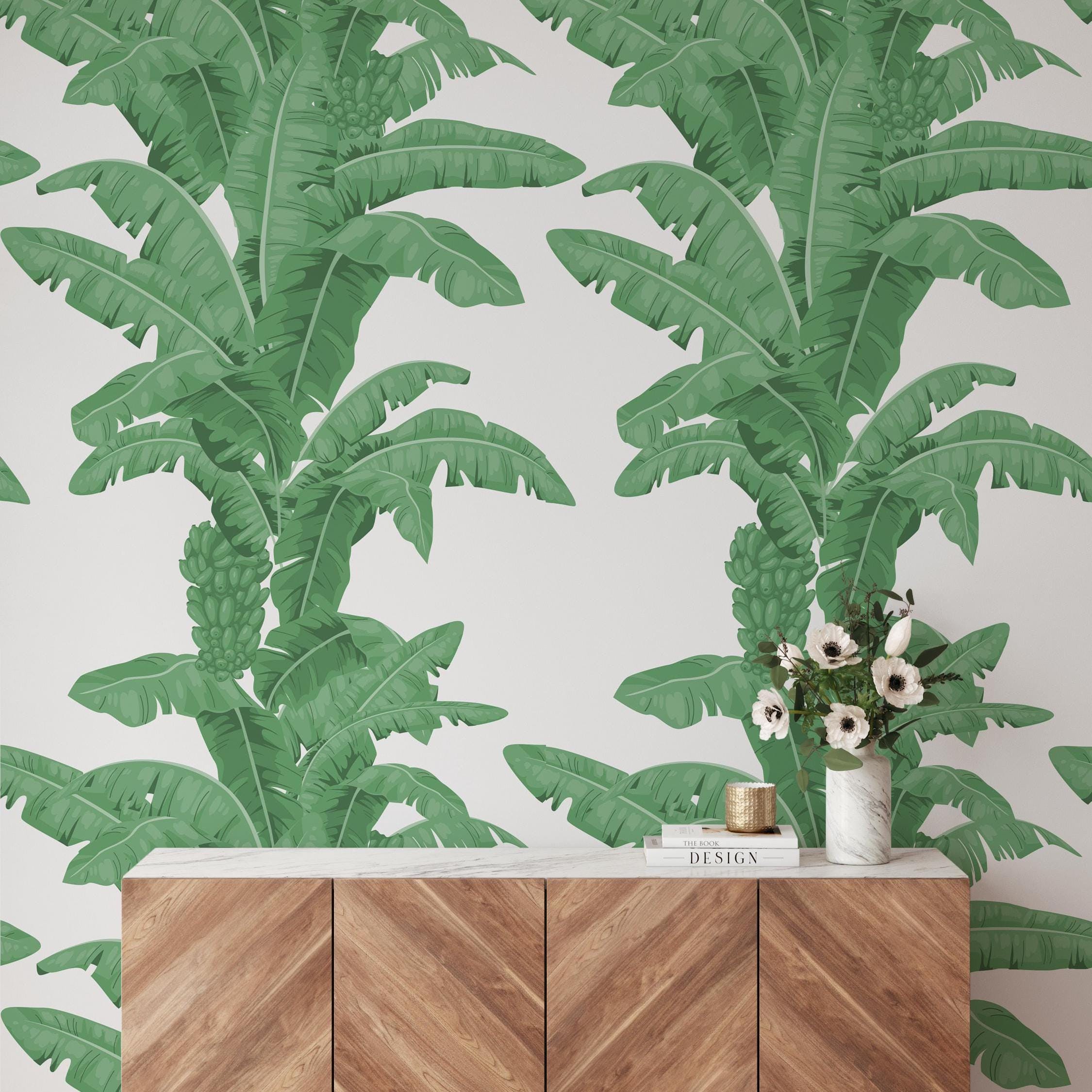 Tropical banana leaves wallpaper with a bold, hand-drawn palm pattern. This listing includes the Black & White, Green, and Yellow color options.