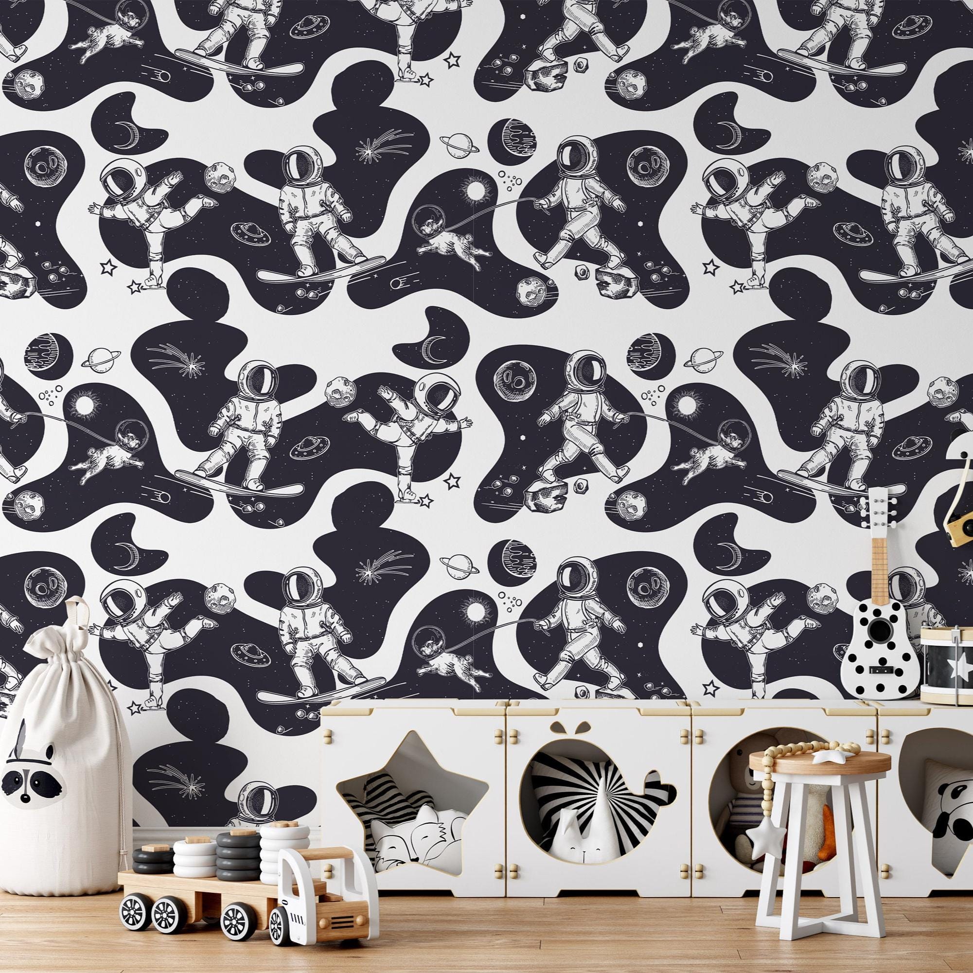 Turn a nursery or playroom into a space adventure with this black-and-white astronaut wallpaper featuring planets and celestial details. The bold monochrome look works well in modern kids rooms and keeps the space playful without becoming visually heavy.