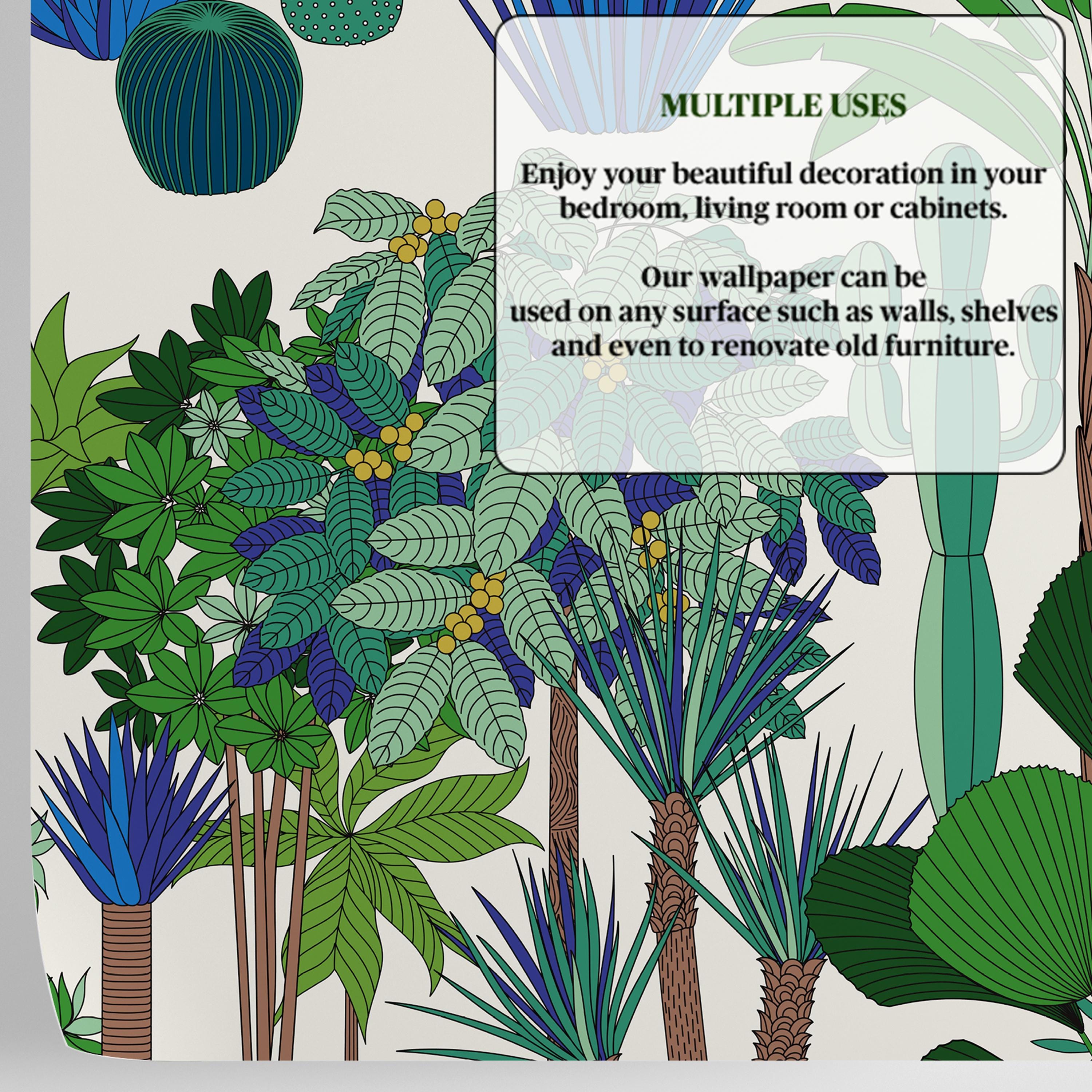 A lush botanical garden on your walls. This tropical wallpaper features an illustrated collection of palms, cacti, agaves, and exotic plants on a clean white background — a fresh, sophisticated design inspired by luxury botanical illustration.