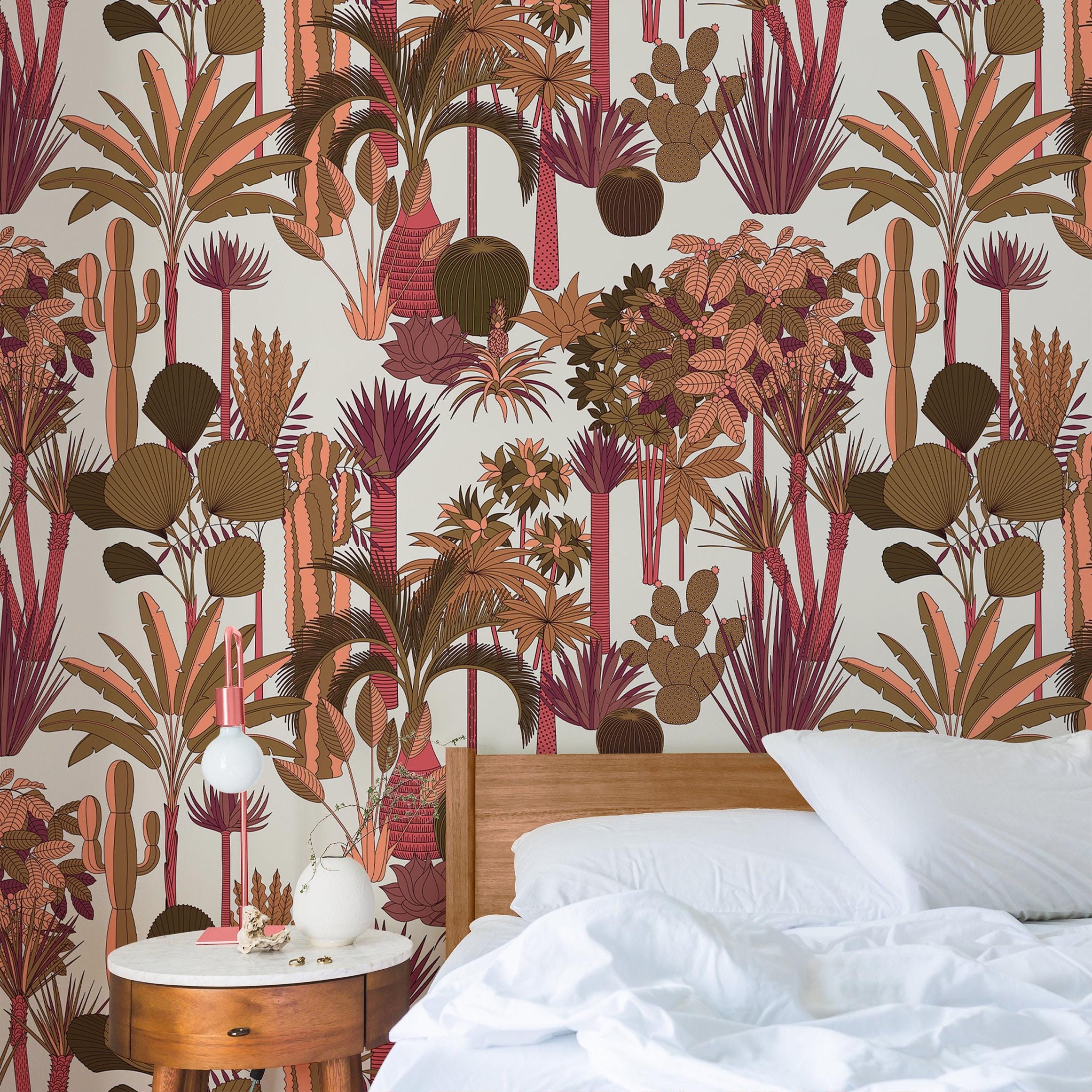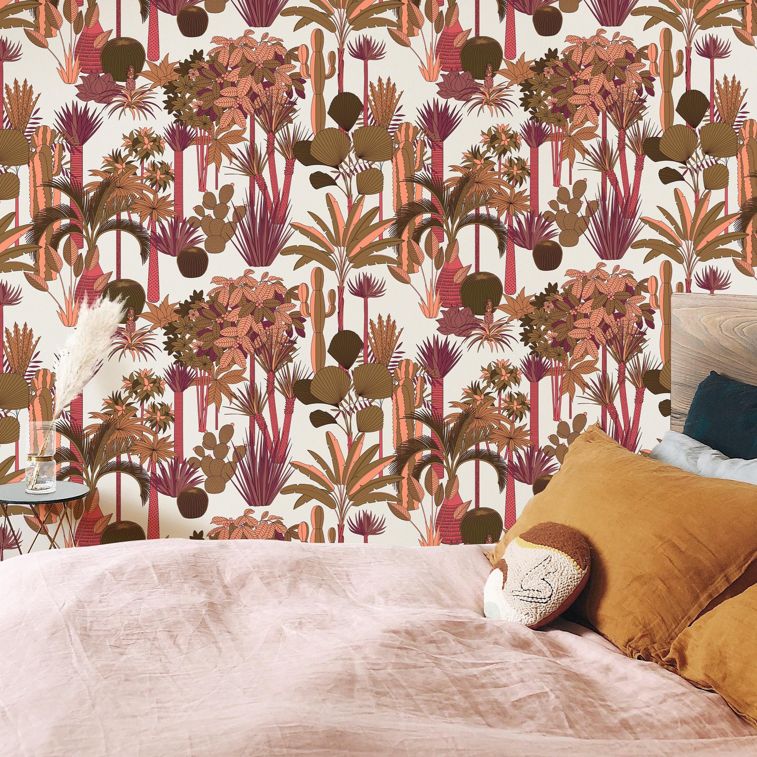 Floral Pink Leaves and Trees Wallpaper with an elegant tropical jungle composition inspired by classic decorative wall art.