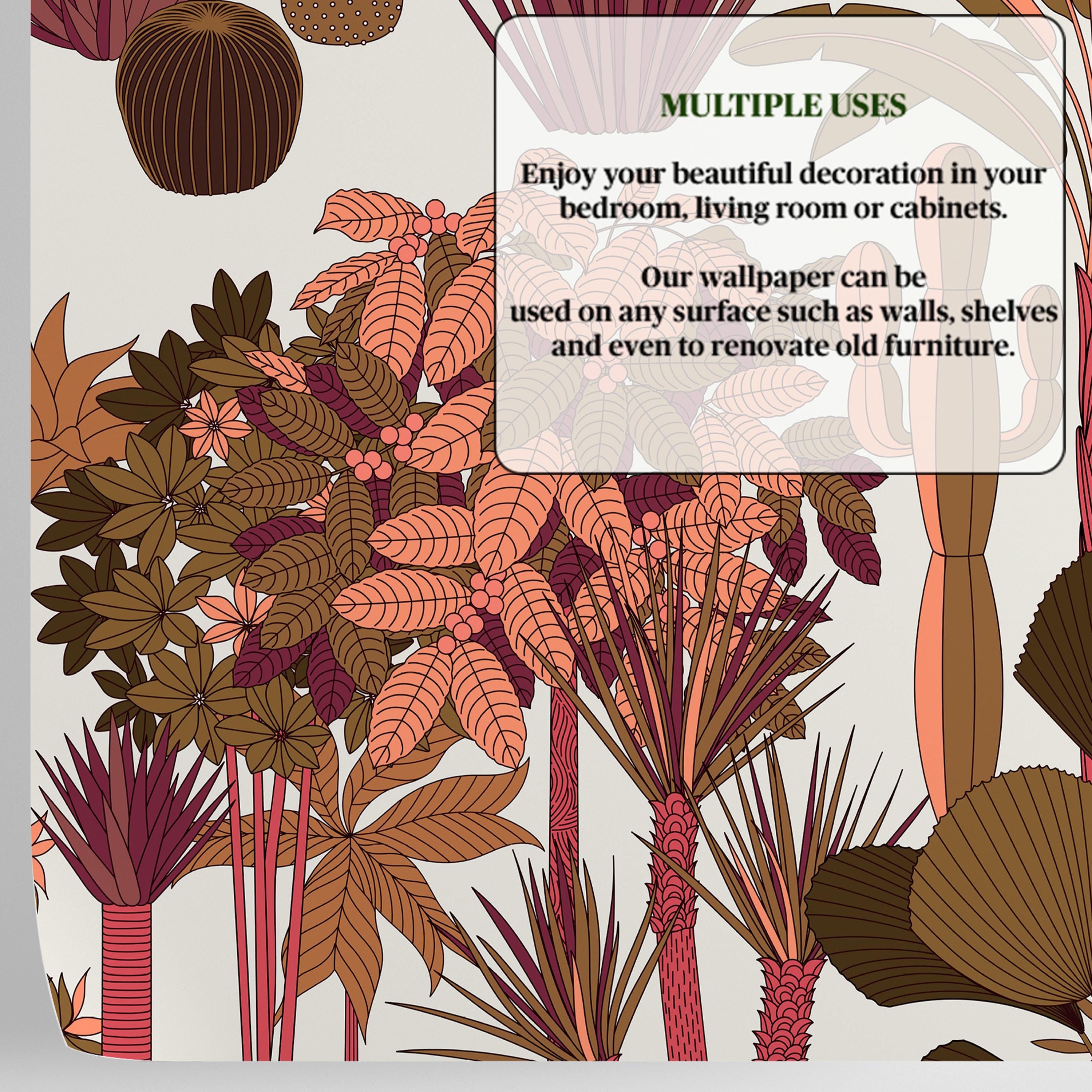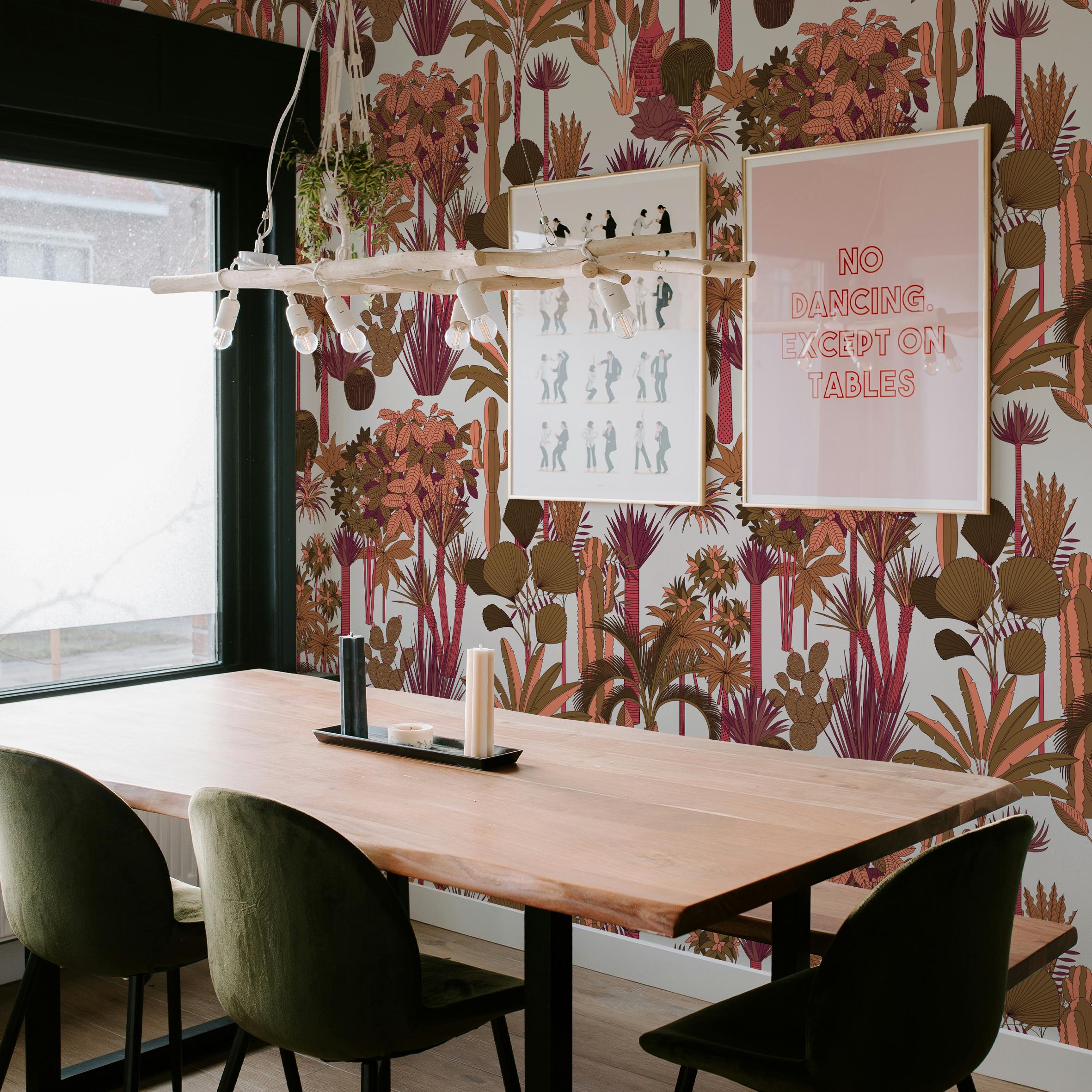 This botanical jungle wallpaper brings warmth, rhythm, and a sophisticated tropical atmosphere into living rooms, bedrooms, dining areas, and creative interiors.
