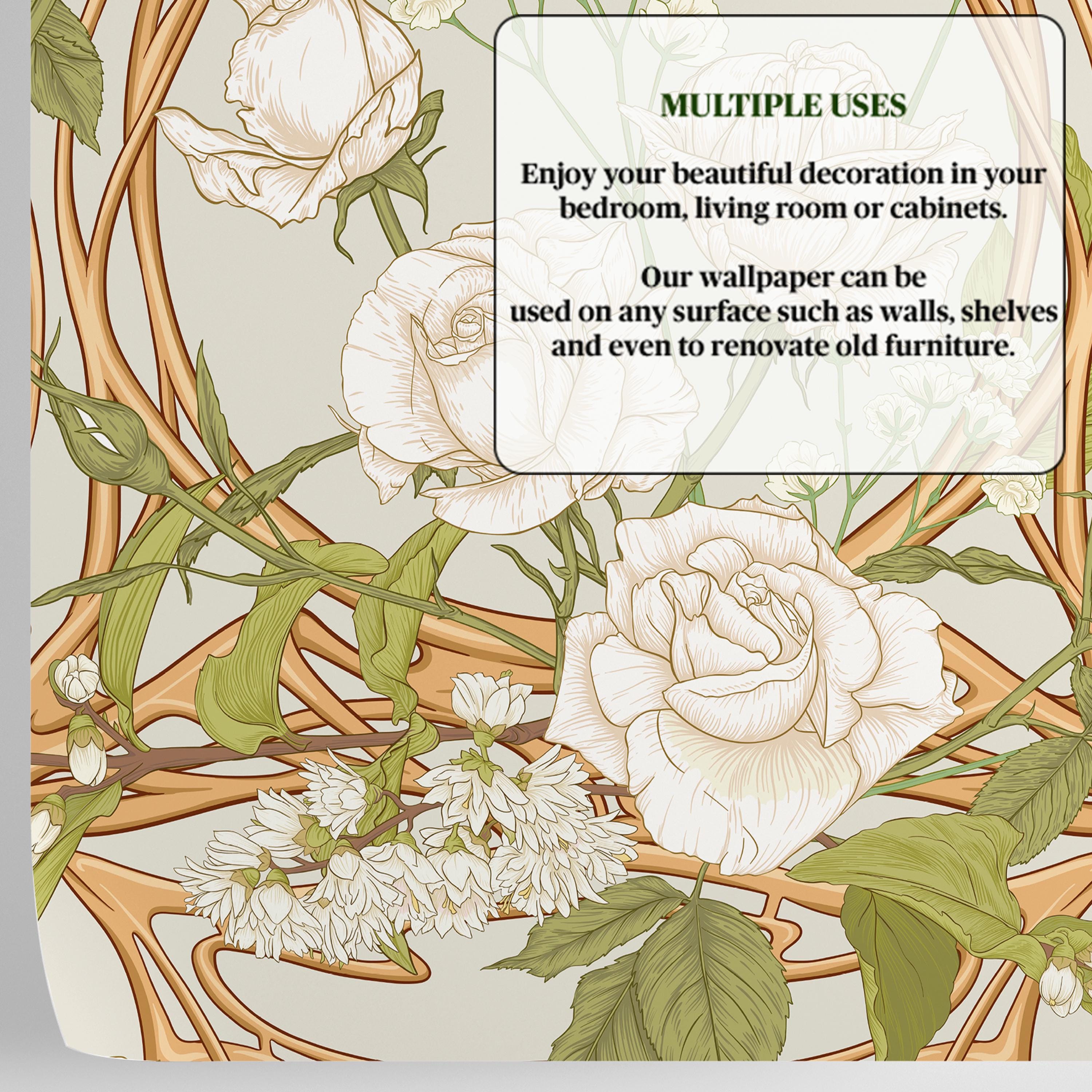 Bring timeless elegance to your walls with this Art Nouveau rose wallpaper. White roses intertwined with golden organic frames create a refined, romantic atmosphere — perfect for a living room, bedroom, or sophisticated reading nook.