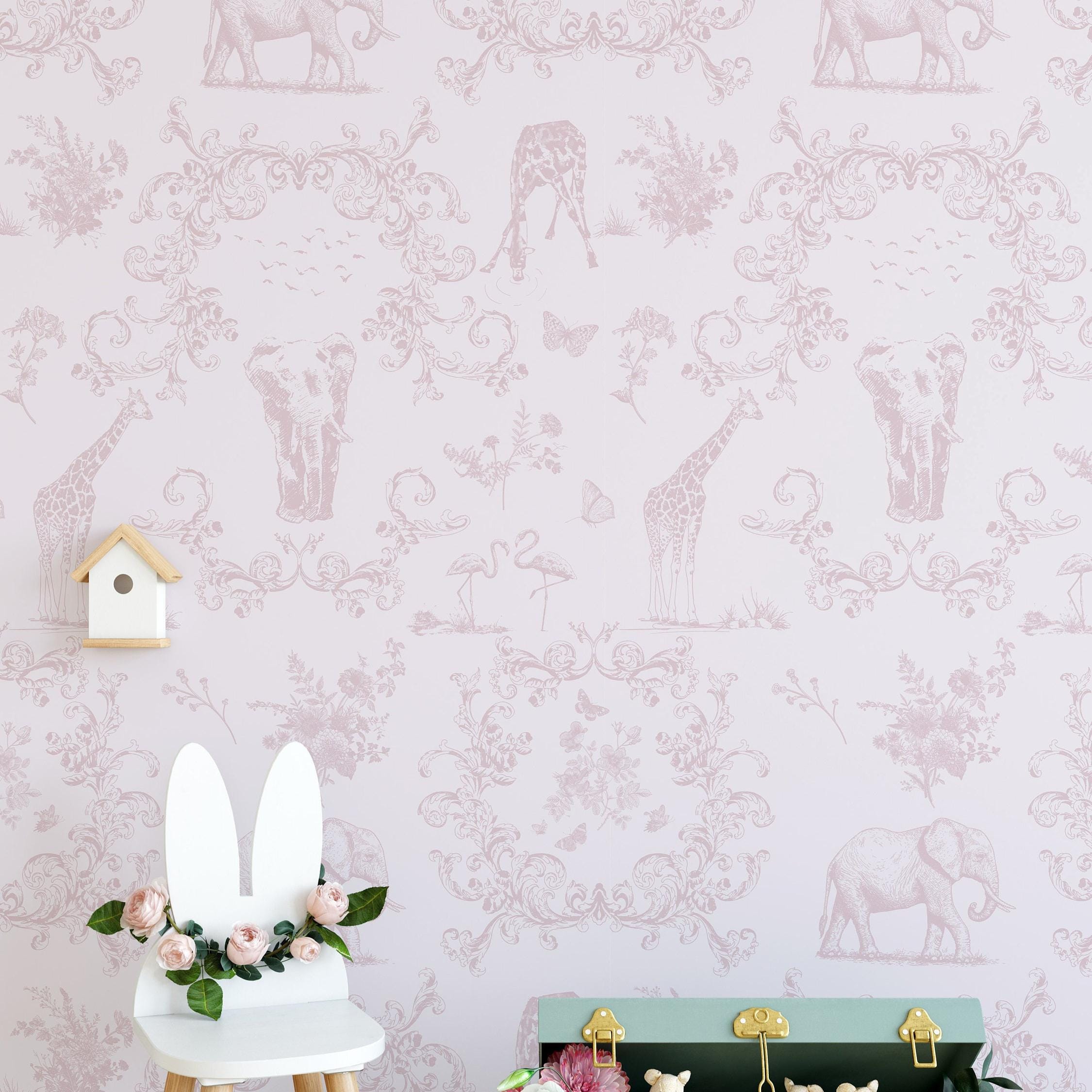 A refined Toile de Jouy inspired design, reimagined with a soft pink palette and a safari twist: elephants, giraffes, flamingos and botanical details arranged like a classic vintage print. From far away it reads elegant and calm; up close you notice the storytelling animals and delicate ornament work—perfect for nurseries, girls rooms, and whimsical interiors with a Victorian touch.