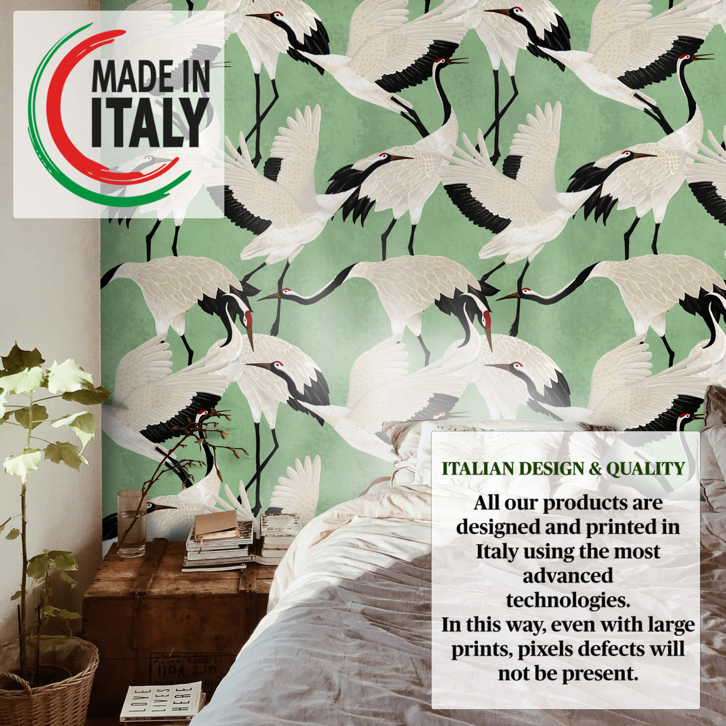 Create a dreamy and romantic atmosphere in your home with our best-selling Japanese white heron wallpaper. Featuring graceful white herons in a minimalist style on a soft green background, this wallpaper is perfect for adding a touch of serenity and romance to any room. Our high-quality wallpaper is easy to install and durable, ensuring that your walls will look beautiful for years to come. Let this stunning white heron wallpaper transport you to a place of tranquility and love.