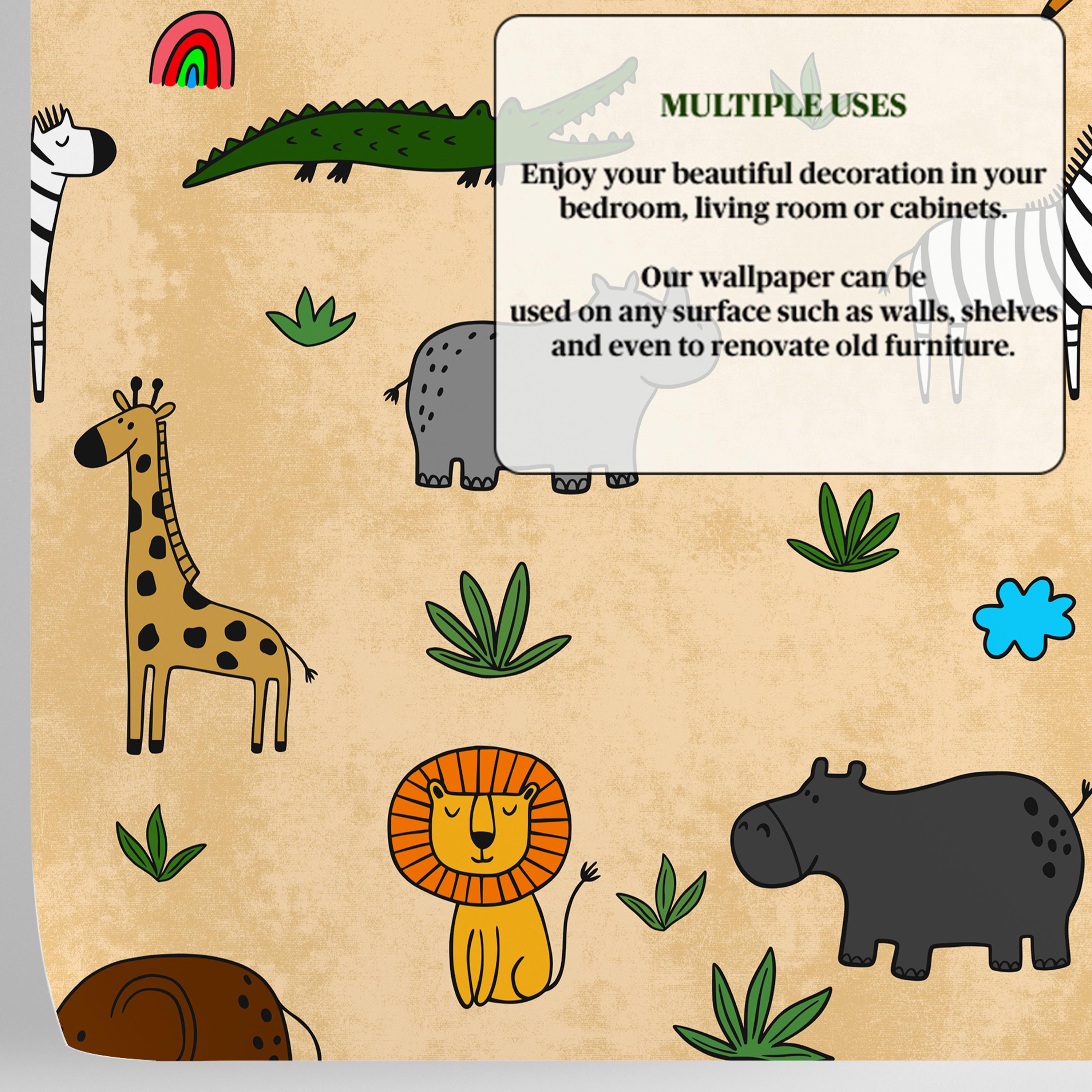 Safari Animal Wallpaper for kids, featuring hand-drawn lions, giraffes, zebras, crocodiles and more on a warm sandy background. A cheerful jungle theme for nurseries, playrooms, and children’s bedrooms—fun, calm, and easy to match with natural wood and neutral tones.