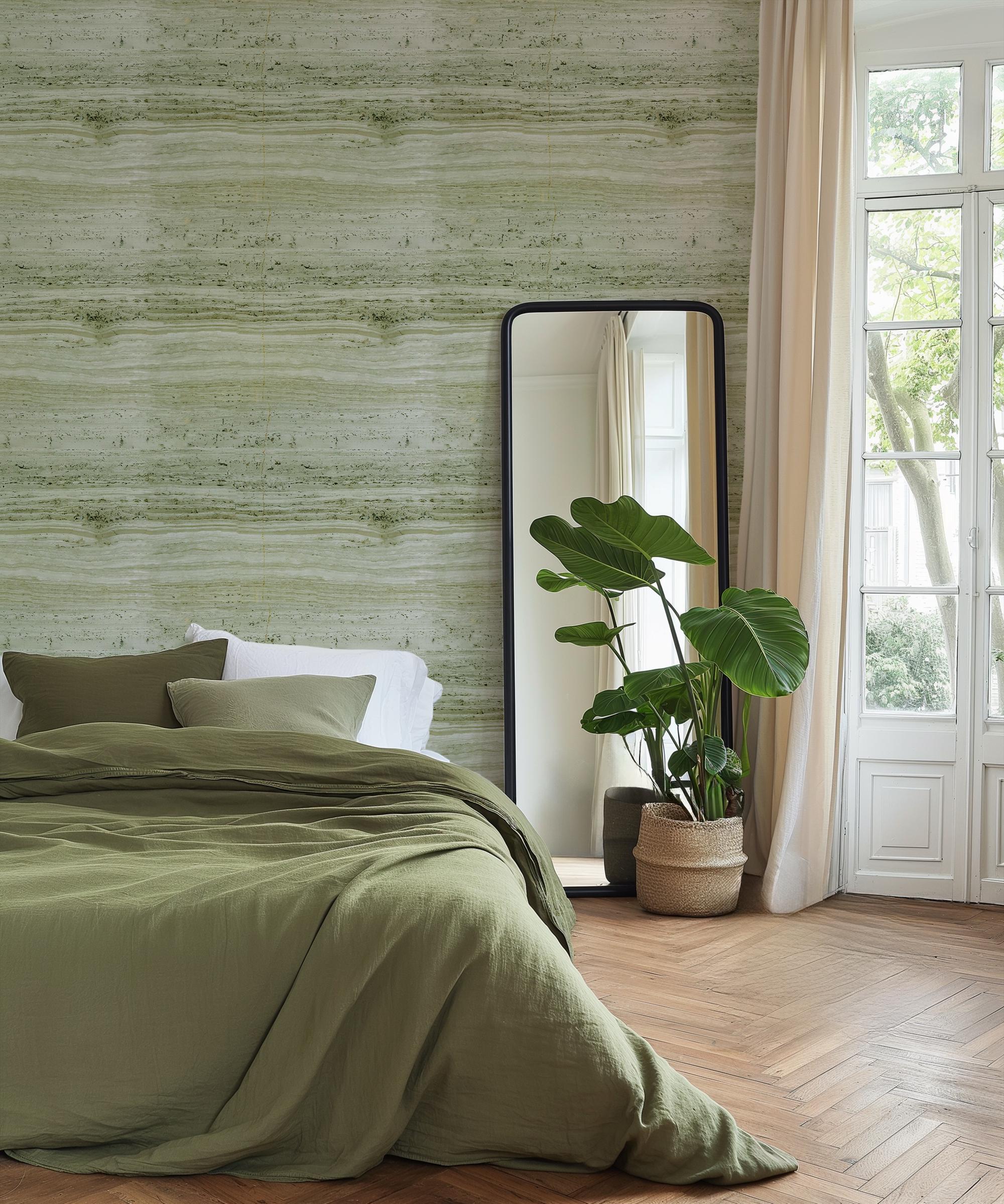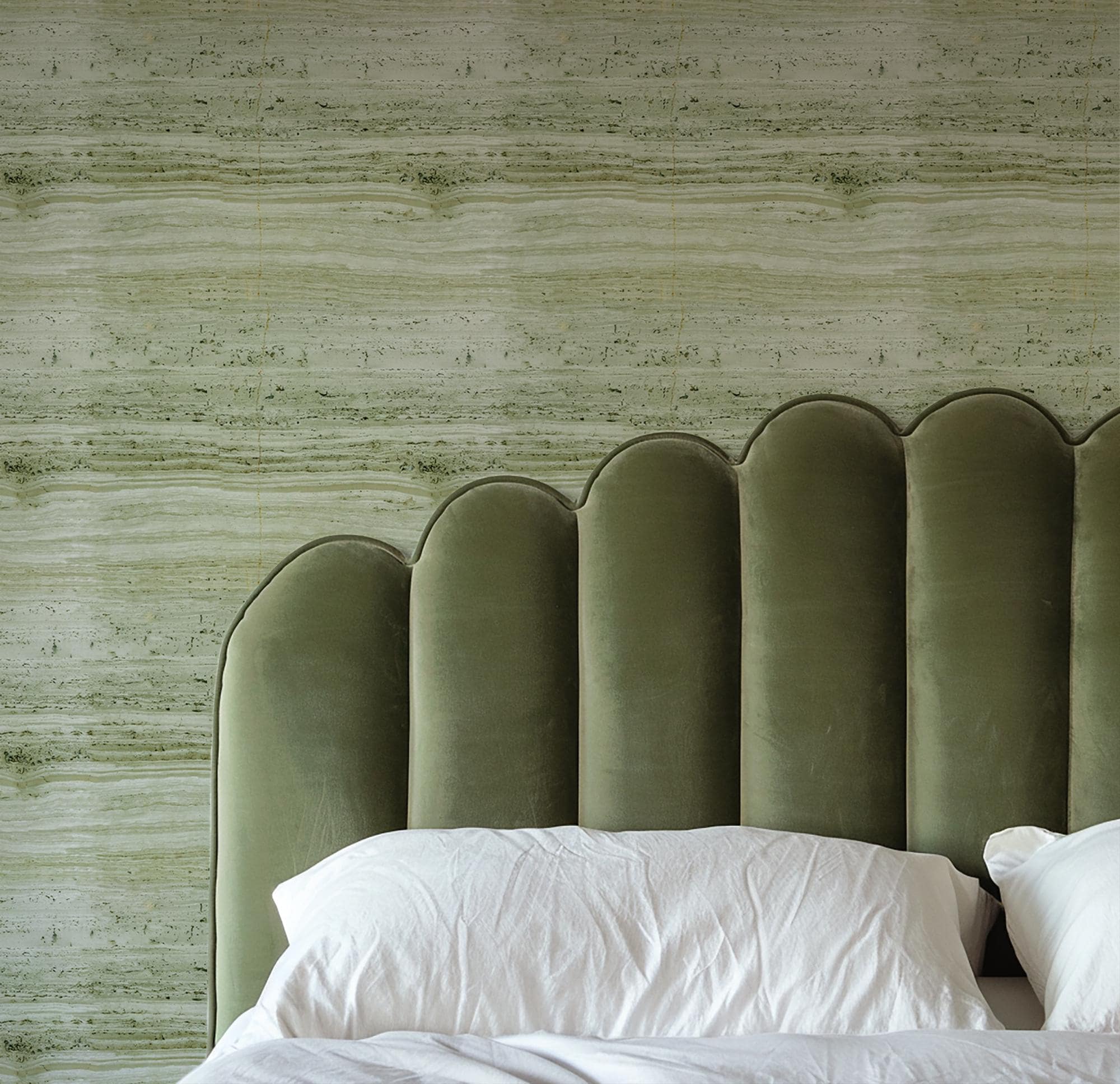 Transform your space with our exclusive Olive Green Travertine Wallpaper: the elegance of natural stone meets the warm, earthy tones that are defining modern interiors.