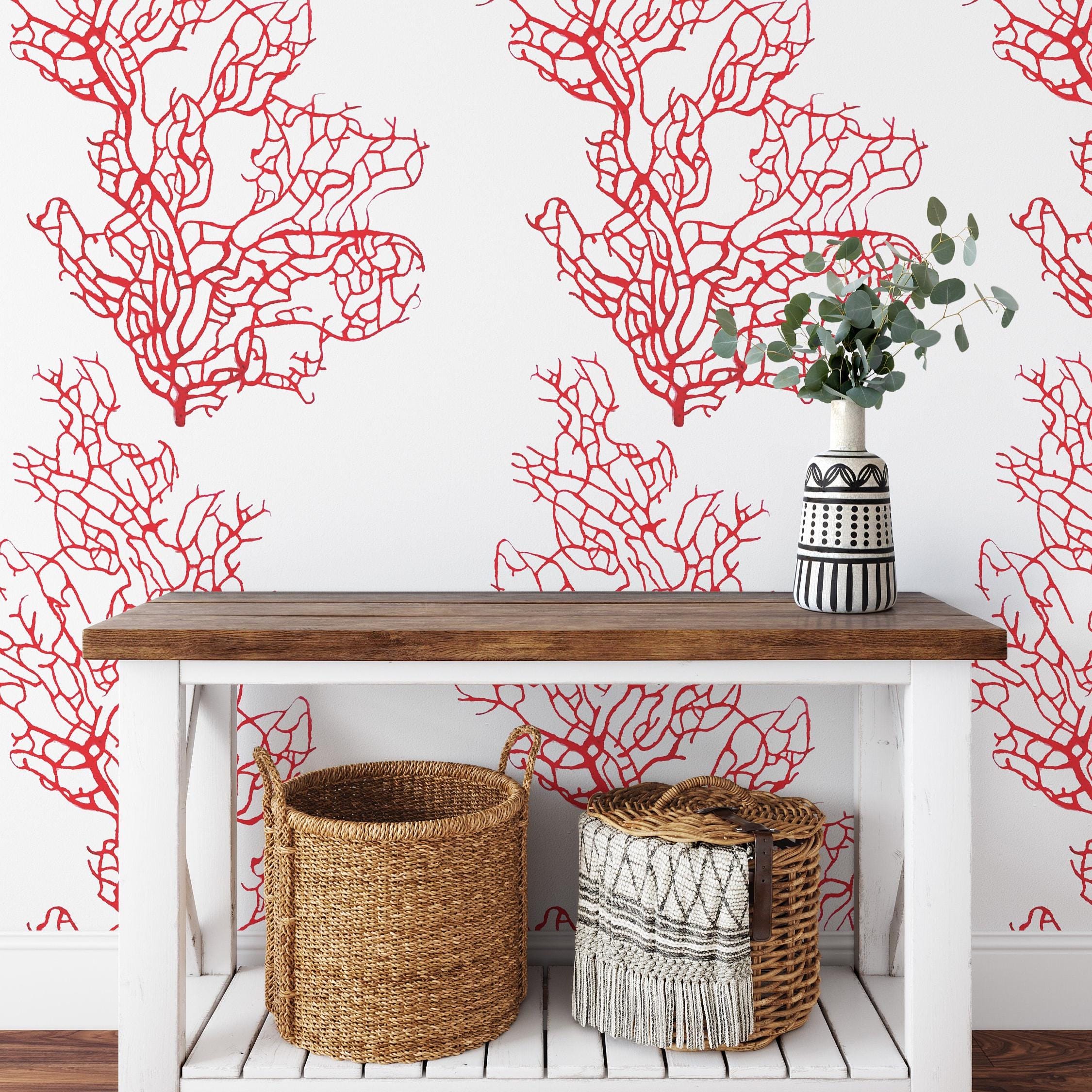 Bring the elegance of the sea into your home. Delicate red coral branches painted in watercolor style float against a crisp white background — sophisticated, coastal, and effortlessly chic. Perfect as a bathroom accent wall, a beach house living room feature, or to add a touch of marine elegance to any space.