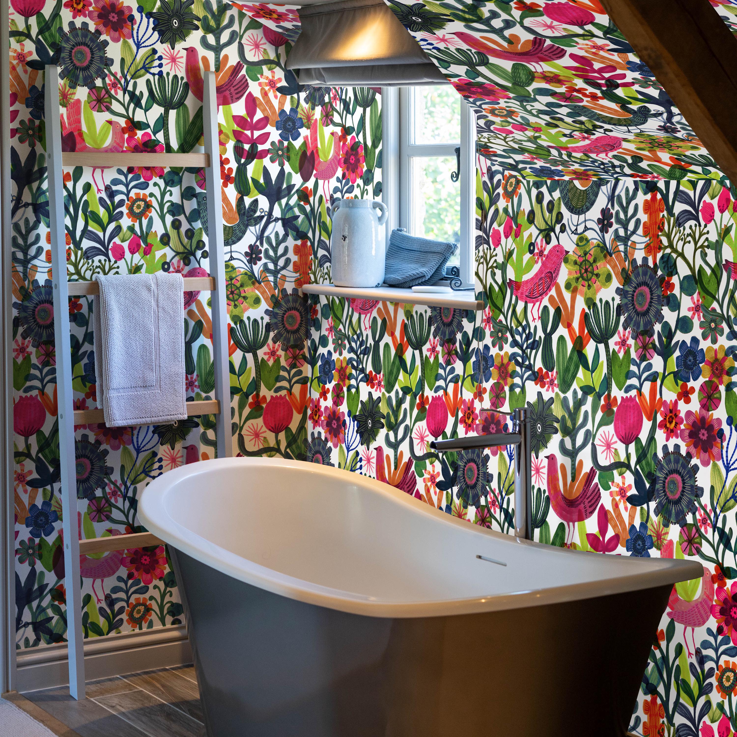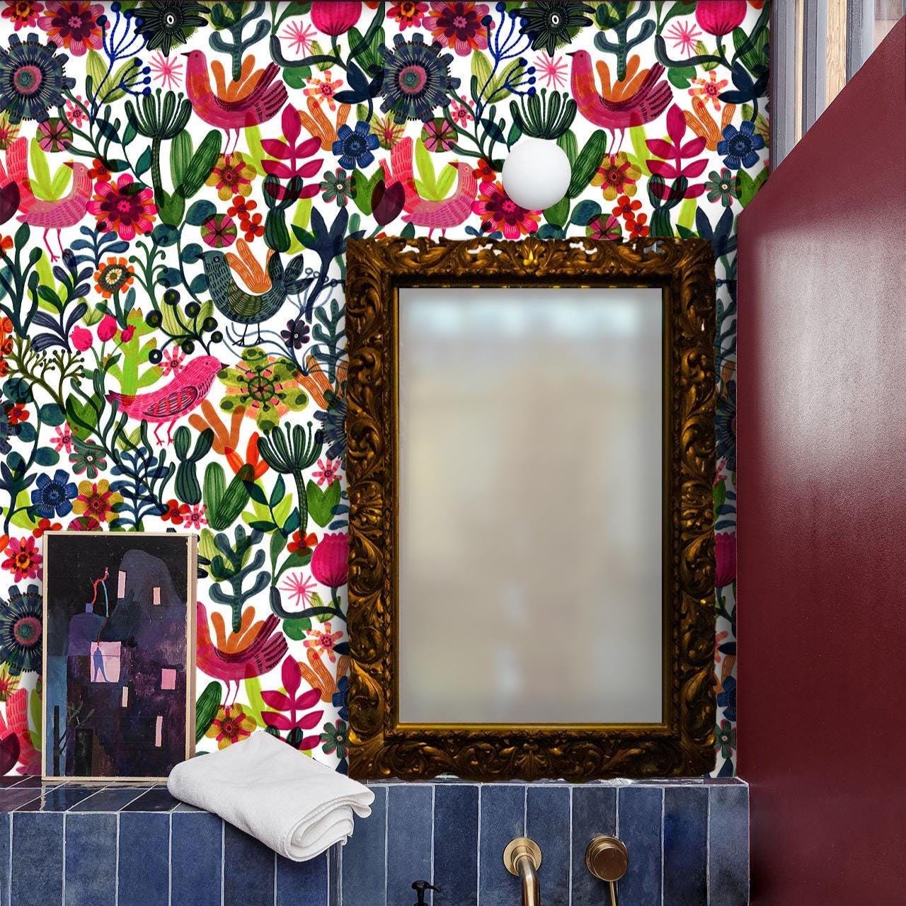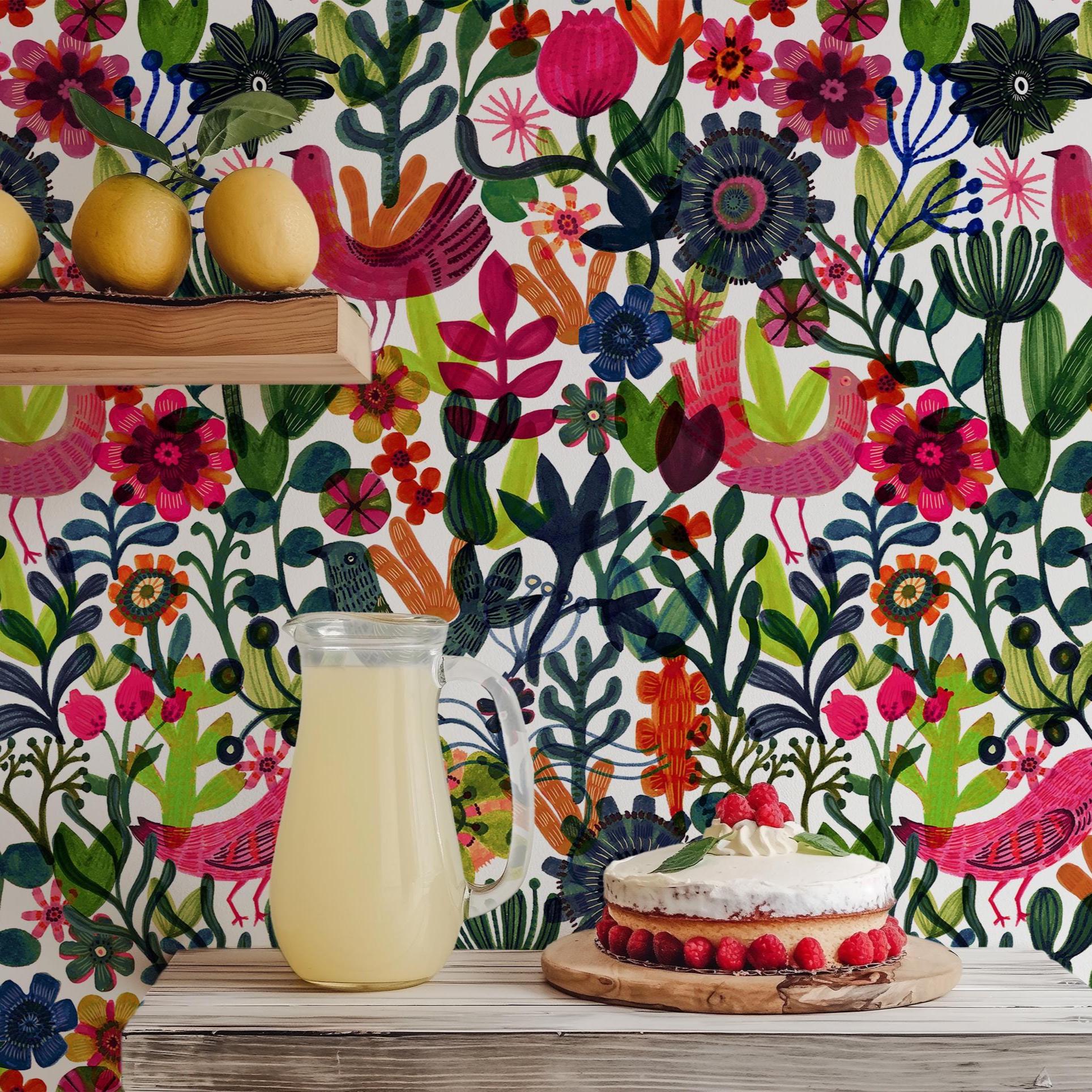 Scandinavian Folk Art Wallpaper: Floral & Bird Botanical Decor, Colorful Accent Wall Paper for Eclectic Home