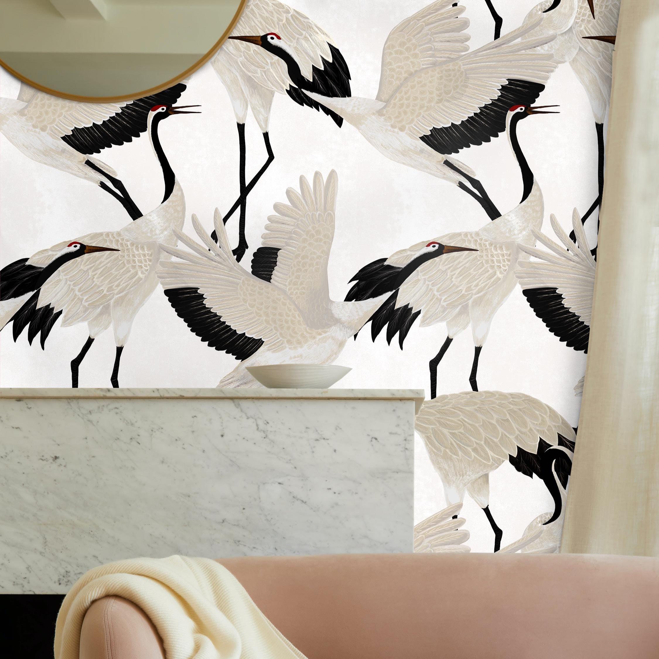 Crane Wallpaper with White Herons, Chinoiserie Bird Wallpaper for Living Room, Vintage Japanese Wall Decor