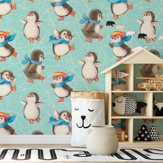Polar Animals Kids Room Nursery Wallpaper, Watercolor Palette Kids Room Decor
